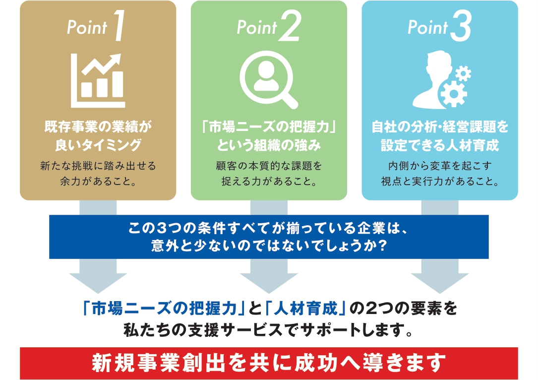 新たな事業を生み出すには、次の3つの条件がそろっていることが重要です。